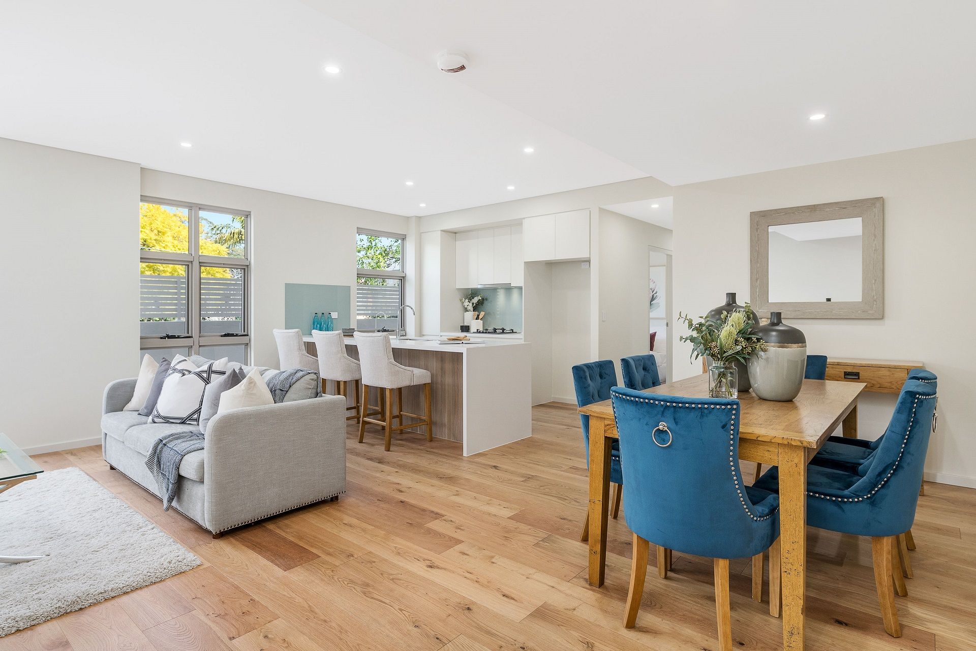Light, bright and welcoming, Rosemill's spacious open-plan living spaces flow seamlessly onto huge entertainers' balconies that provide an idyllic spot to relax or spend time with friends and family. Floor-to-ceiling windows fill the home with an abundance of natural light and provide gorgeous, leafy views from every angle, whether you're relaxing on the sofa, prepping dinner, or sitting down at the dining table to enjoy a meal with friends.